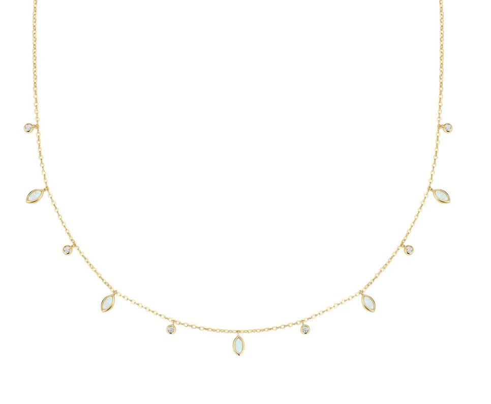 This necklace is made from 925 sterling silver and finished with 1.0 microns of 18K gold plating. It features thoughful detailing, with alternating Cubic Zirconia and genuine Opals. Protected with a clear e-coating to help prevent tarnish and wear.